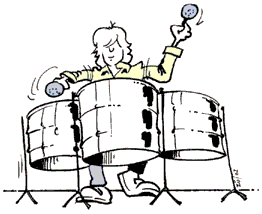 2Tenor-Pan (Melodie) 1 Second-Pan 2 Guitar-Pan 1 Dreier-Bass-Pan Kongas, Bongos, Timbales Klein-Rhythmus  |